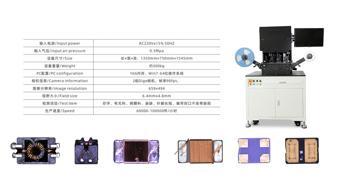 檢測項目:印字、有無料、側(cè)翻料、崩缺、針腳長短、編(biān)帶封口不良等缺陷